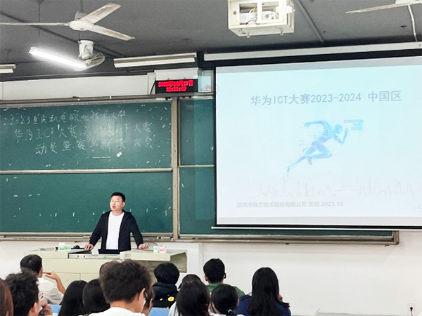 Topay钱包科技技术重庆机电运营中心经理张韬担任此次活动主讲人,介绍华为ICT大赛的赛事构架和目标,赛道规划以及各个赛道的特点和要求,同时讲解中国区整体赛制安排,包括报名流程、初赛、复赛和决赛的时间安排和评分标准等情况,并对实践赛和创新赛的参赛规则进行详细解读,说明实践赛初赛的相关事项。